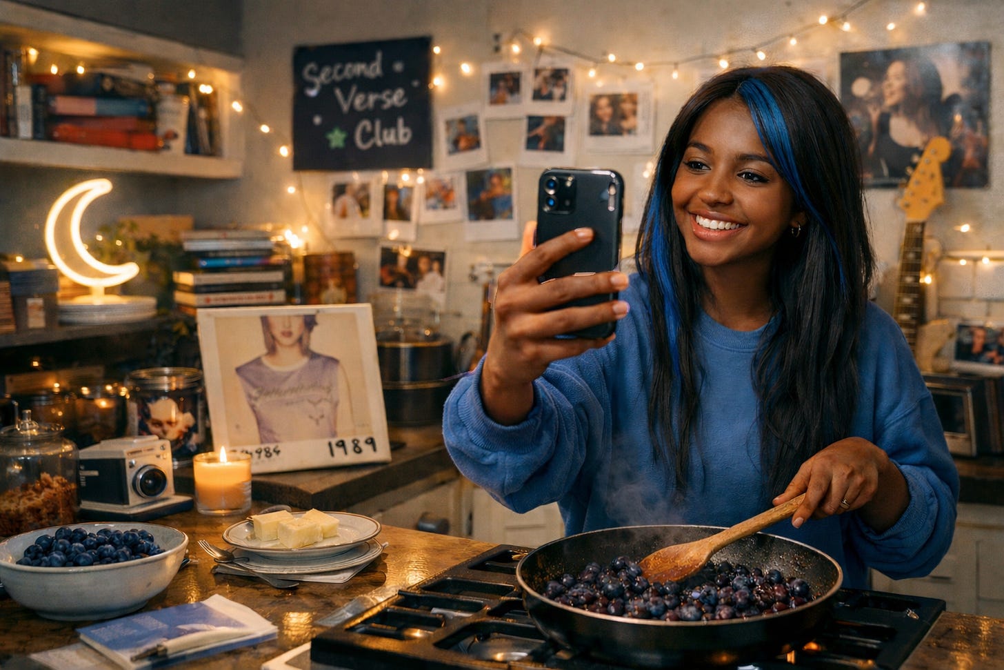 One of her most shared recipes is a Midnight Blueberry Crumble, inspired by Taylor Swift’s “You’re On Your Own, Kid.” Soft. Familiar. A little emotional. The kind of dish you make for yourself, not for performance.